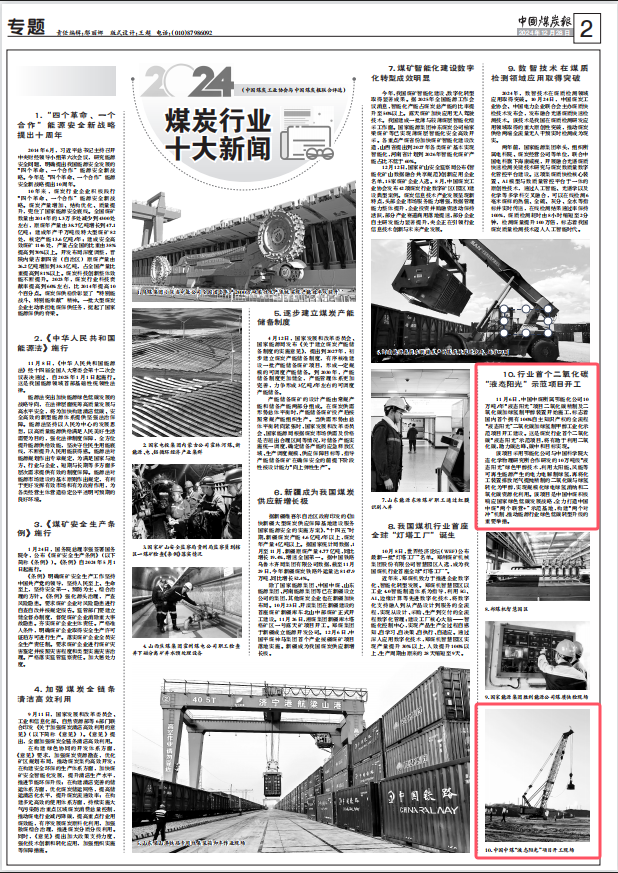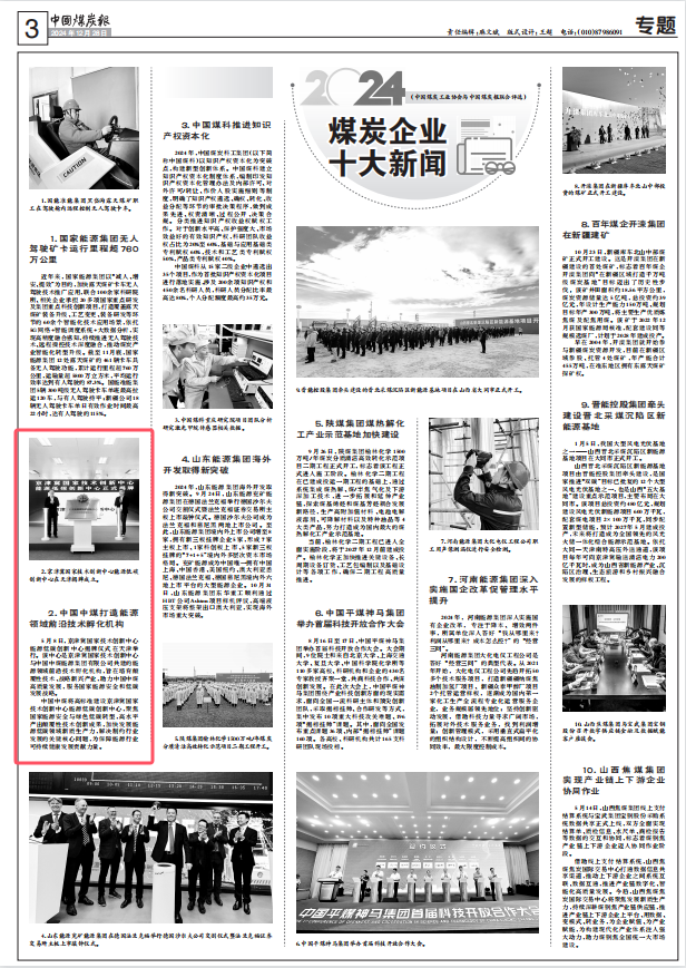 日前,中国煤炭工业协会与中国煤炭报联合评选发布2024年煤炭行业十大新闻、2024年煤炭企业十大新闻、2024年煤炭科技十大新闻。《行业首个二氧化碳“液态阳光”示范项目开工》入选煤炭行业十大新闻、《中国中煤打造能源领域前沿技术孵化机构》入选煤炭企业十大新闻,《中煤“地知”大模型一期成功上线》《世界首台(套)超长运距智能刮板输送装备联合试运转成功》入选煤炭科技十大新闻。